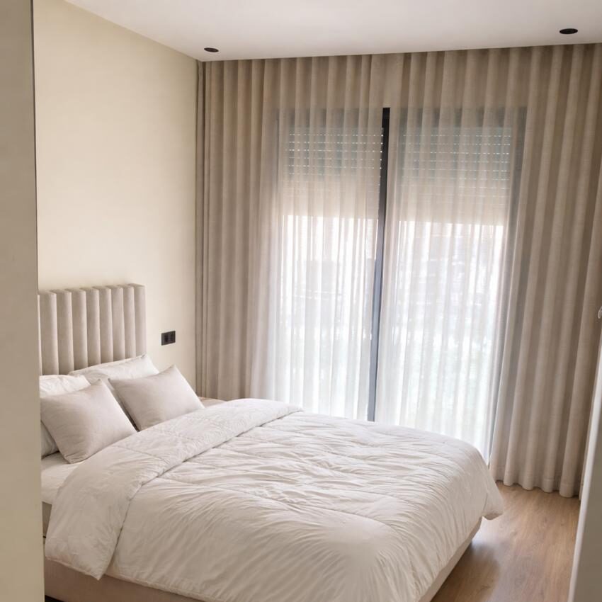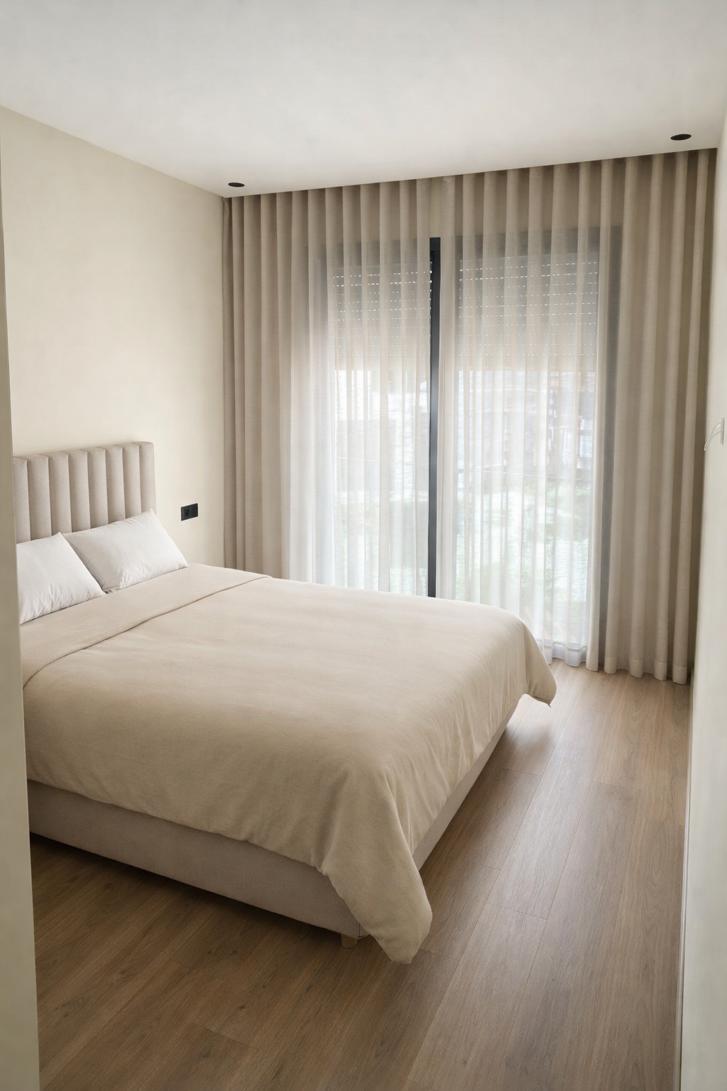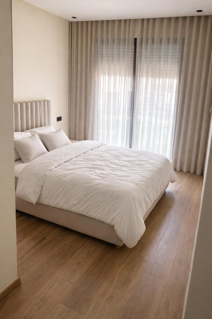 L’espace nuit comprend deux chambres confortables et lumineuses, soigneusement aménagées avec des matériaux doux et une décoration minimaliste, favorisant repos et tranquillité. Les grandes fenêtres et rideaux pleine hauteur apportent une belle luminosité tout au long de la journée.