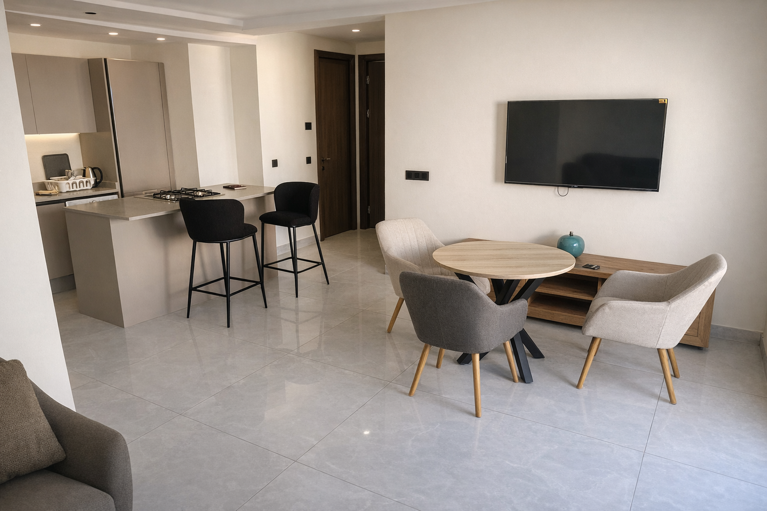 Dès l’entrée, l’appartement séduit par son design contemporain et ses espaces ouverts, créant une atmosphère à la fois chaleureuse et raffinée. Le salon, baigné de lumière naturelle grâce aux grandes baies vitrées, offre un espace de détente agréable avec un mobilier moderne et épuré. Il s’ouvre sur un coin repas convivial ainsi qu’une cuisine américaine entièrement équipée, idéale pour préparer vos repas en toute simplicité.