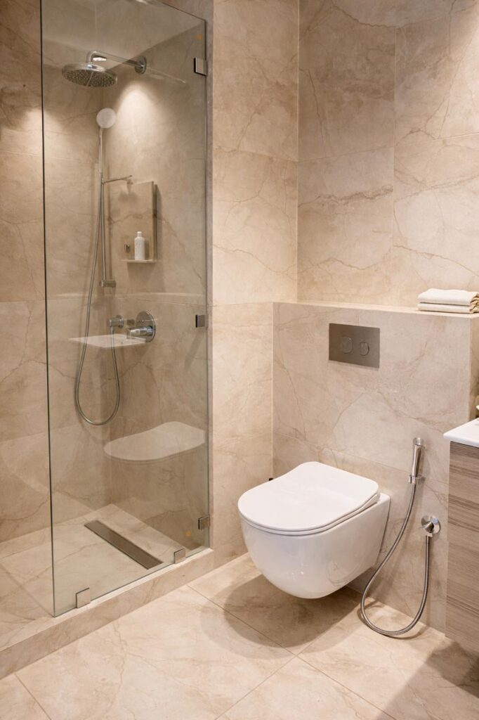 L’appartement dispose également de deux salles de bain modernes, aux finitions soignées, équipées de douches contemporaines et d’aménagements pratiques pour un maximum de confort.