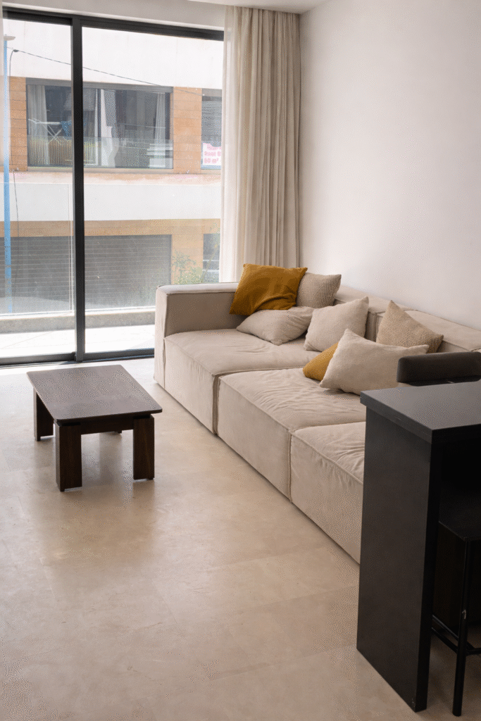 Situé au 1er étage, l’appartement bénéficie d’un espace de vie lumineux et bien agencé. Le salon, aménagé avec un canapé confortable et une décoration moderne, constitue un espace idéal pour se détendre après une journée en ville. De grandes baies vitrées apportent une belle luminosité naturelle et donnent accès au balcon, créant une atmosphère agréable et ouverte.